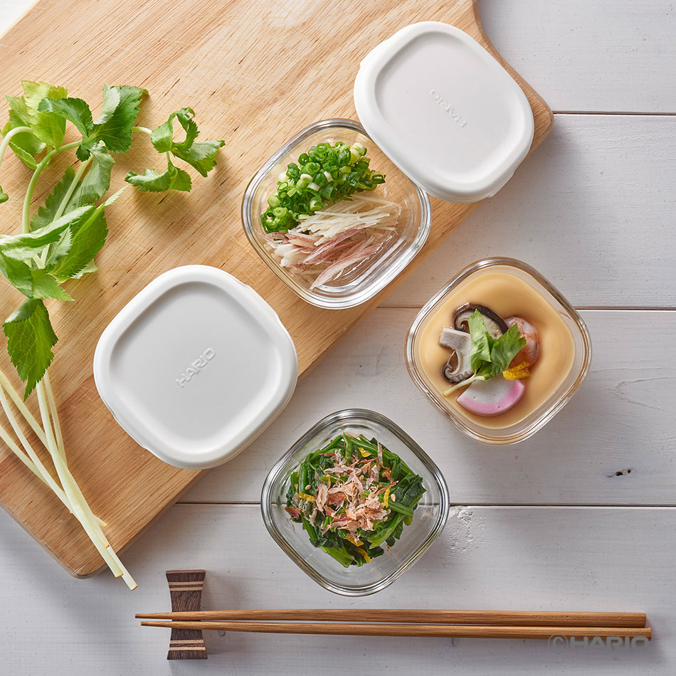 耐熱ガラス製のフタつき角小鉢4個セットです。
