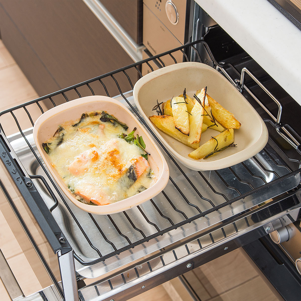 高温に対応できるため、様々なレシピに使うことができます。また、オーブンや電子レンジはもちろん、トースターにも対応しています。 - 土の温もりを感じられる陶器製で、グラタンはもちろん、幅広いオーブン料理に使えます。