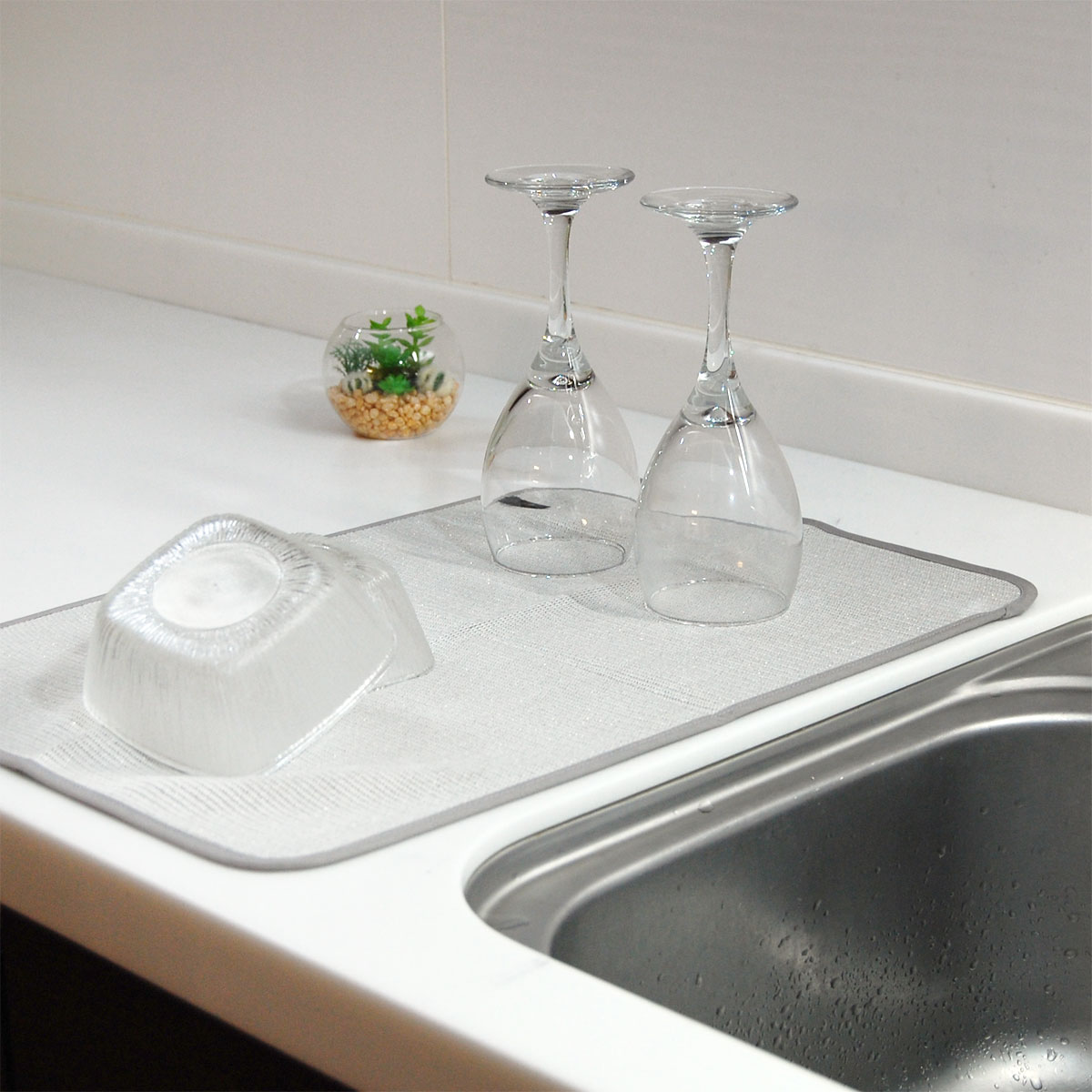 吸水性が高く、大量の水分を吸収できます。水を含んだマットは絞ればすぐに吸水力が戻ります。ニット地の3層構造でクッション性があり、食器や調理器具を傷つけにくくなっています。