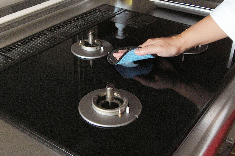 乾いたマイクロファイバークロスで天板や前面パネル等、コンロまわりを全体的に拭き上げ、ツヤを出します。