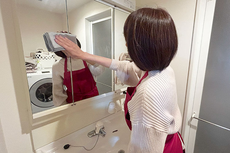 例えば、食事後のテーブルはウェットティッシュやふきんで拭く、手拭き用タオルを洗濯機に入れる前に洗面台の鏡を拭くなど、5分以内で小さく掃除をします。