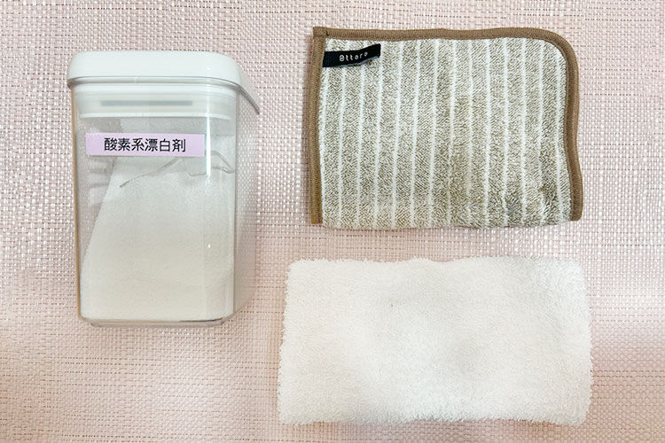 左の酸素系漂白剤は換気扇や排水溝の掃除、靴の汚れ取り等に使います。